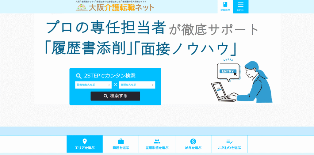 大阪介護転職ネット | 面接への同席や入社後フォローまで対応 求人票にない職場の実情も説明 求人数は少なめ | 約1,300件 | 16職種~ |