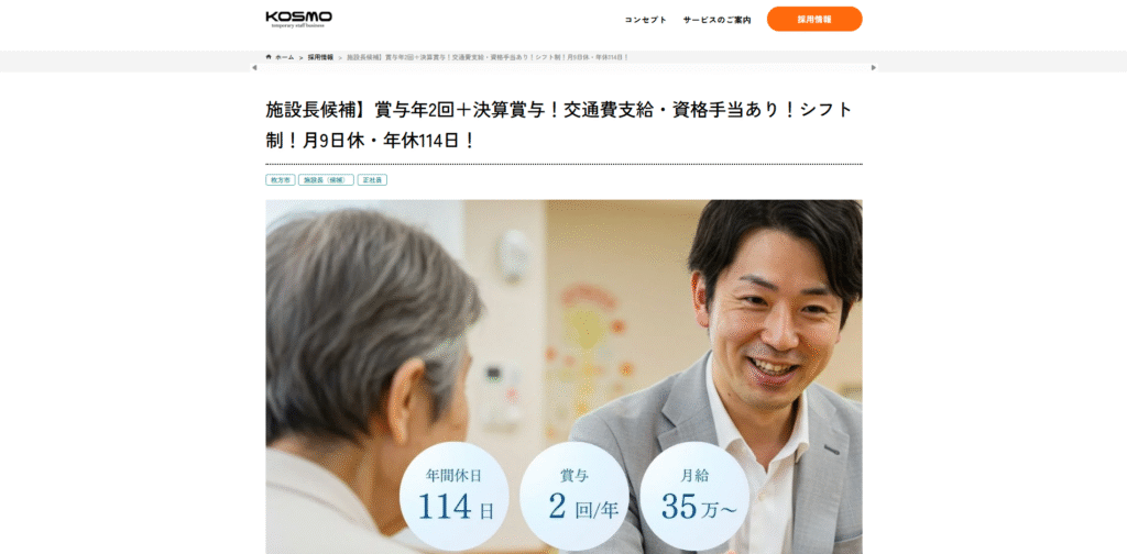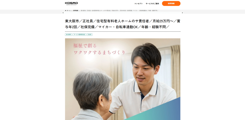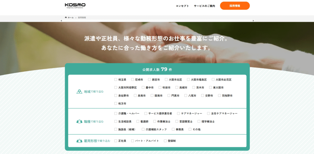 KOSMO介護は、35年以上大阪で人材事業を展開してきたKOSMO社による介護特化型サービス。公開求人数は約79件と少数ながら、在職者向けに休日・勤務時間外の面談にも対応しています。