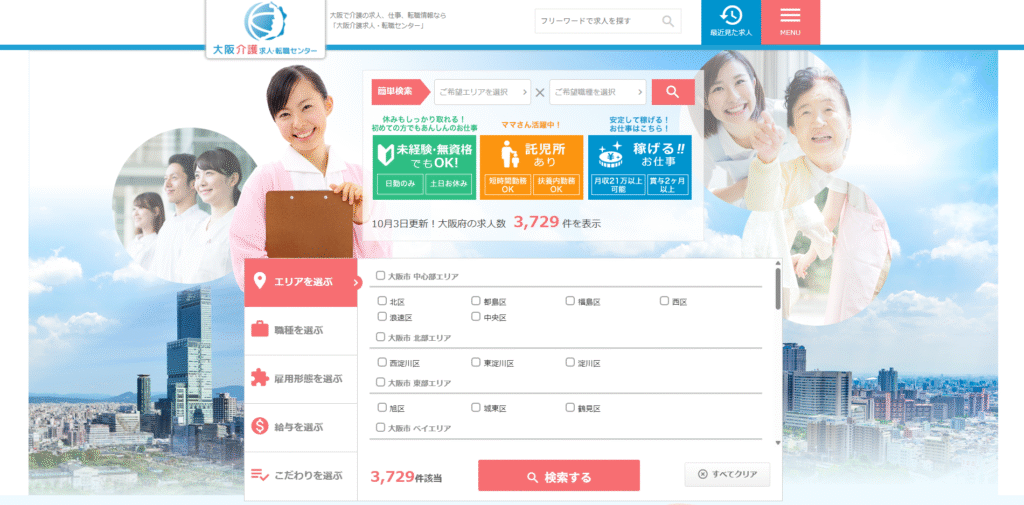 大阪介護求人・転職センターは、約4,000件の大阪府内求人を掲載し、特養・老健・訪問介護・デイサービスなど施設形態が豊富なのが特徴。独自ルートの求人や、未経験・無資格OKの仕事も多く掲載されており、選択肢の幅が広いのが魅力です。