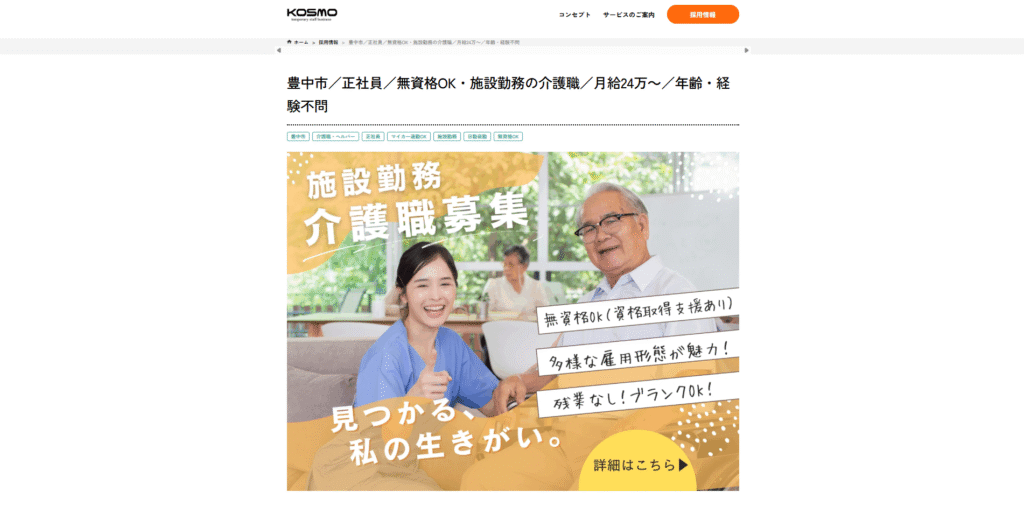 ![]() ![]() 【KOSMO介護】 ![]() ![]() | 大阪で35年以上続く老舗人材企業が運営 正社員登用を目指す求人が中心 公開求人数は少ない | 約80件 | 13職種~ |